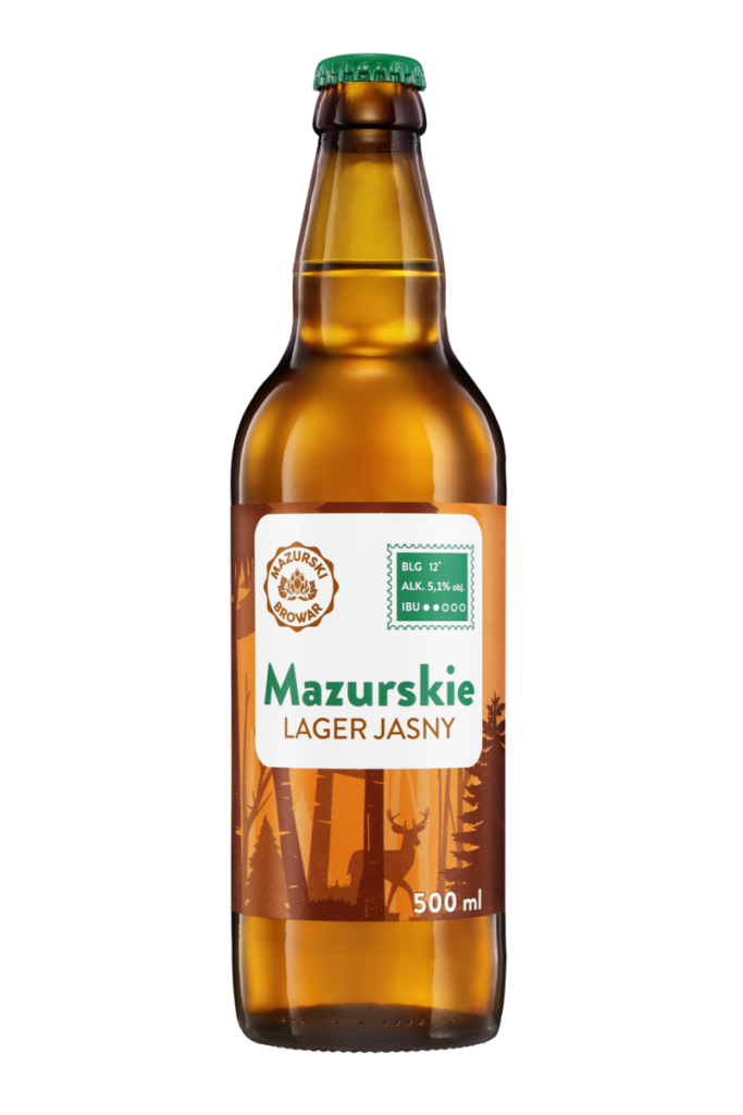 Mazurskie LAGER Jasny to klasyczne piwo dolnej fermentacji w stylu Czech Lager o 5,1 % alkoholu i ekstrakcie 12 % wag. Warzone z mazurskiej wody, słodów pilzneńskiego i karmelowego oraz chmieli Magnat, Marynka i Saaz, wyróżnia się idealnym balansem łagodnej goryczki i rześkości, złocistym kolorem oraz gęstą, śnieżnobiałą pianą. Piwo jest nasycone azotem, co nadaje mu kremową teksturę i bardzo pijalny charakter.