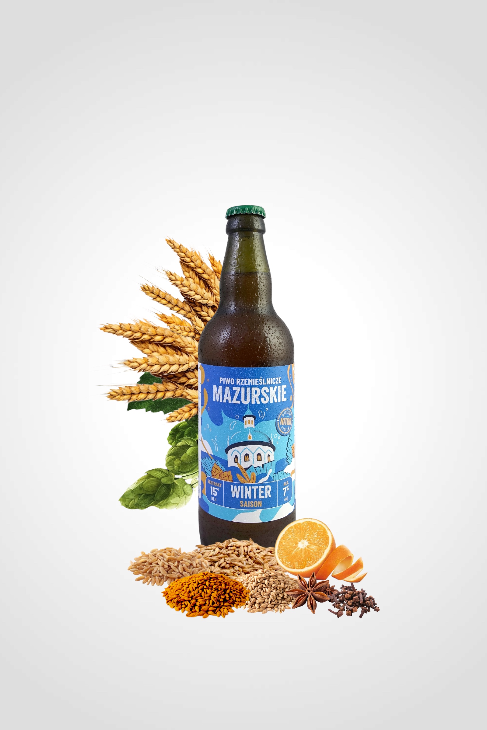 Mazurskie Saison Winter to rzemieślnicze piwo górnej fermentacji w stylu Saison o mocy ok. 6,5 % alkoholu, uwarzone z mazurskiej wody oraz mieszanki słodów (pilzneński, monachijski, karmelowy) i aromatycznych przypraw: skórki pomarańczy, anyżu i goździków. Charakteryzuje się pełnym, korzennym aromatem i wytrawnym finiszem — idealne na chłodniejsze dni. Piwo zostało nagrodzone brązowym medalem GOOD BEER Poland 2025.